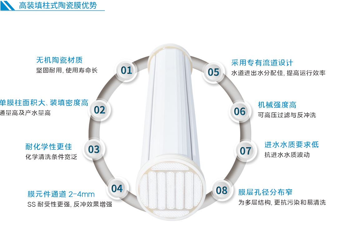 抖圈人生就是搏高裝填柱式陶瓷膜是在抖圈人生就是搏傳統(tǒng)管式陶瓷膜及平板式陶瓷膜技術(shù)基礎(chǔ)上研制出的一款用于水處理的無機(jī)超濾膜。高裝填柱式陶瓷膜是采用高強(qiáng)度α-Al2O3在高溫下焙燒制成,擁有良好的耐高溫性能,抗化學(xué)腐蝕性,優(yōu)秀的機(jī)械強(qiáng)度。相對(duì)傳統(tǒng)多通道管式陶瓷膜,高裝填柱式陶瓷膜單支膜管過濾面積可達(dá) 10-25 ㎡,擁有更大的裝填密度及處理能力,能夠有效去除固體懸浮物、細(xì)菌以及膠體等物質(zhì),可應(yīng)用于民用安全用水、市政給水和廢水處理、應(yīng)急供水、水回用、工業(yè)過程廢水等多個(gè)領(lǐng)域。